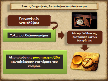 Από τις Γεωγραφικές Ανακαλύψεις στο Διαφωτισμό Γεωγραφικές Ανακαλύψεις Τολμηροί θαλασσοπόροι Με την βοήθεια της Γεωγραφίας και των Εφευρέσεων Αξιοποιούν την μαγνητική πυξίδα και ταξιδεύουν στα πέρατα του κόσμου.